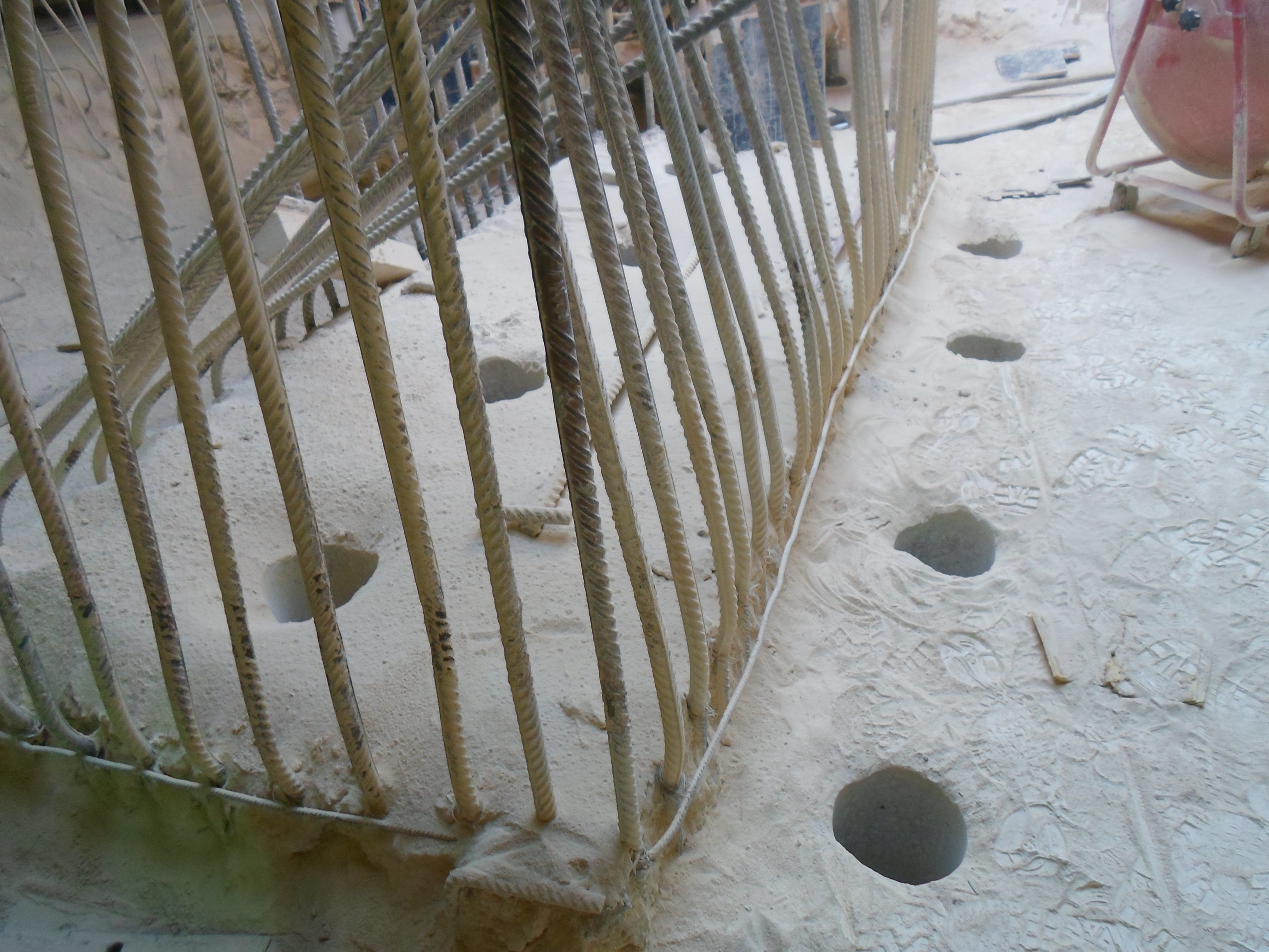 تم إنزال الأقفاص إلى داخل الثقوب، ومن ثم صب خلطة المايكرو بايلز الخاصة بالتدعيم.