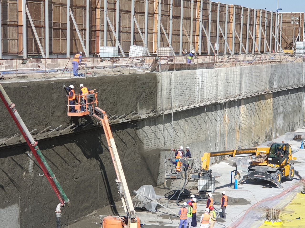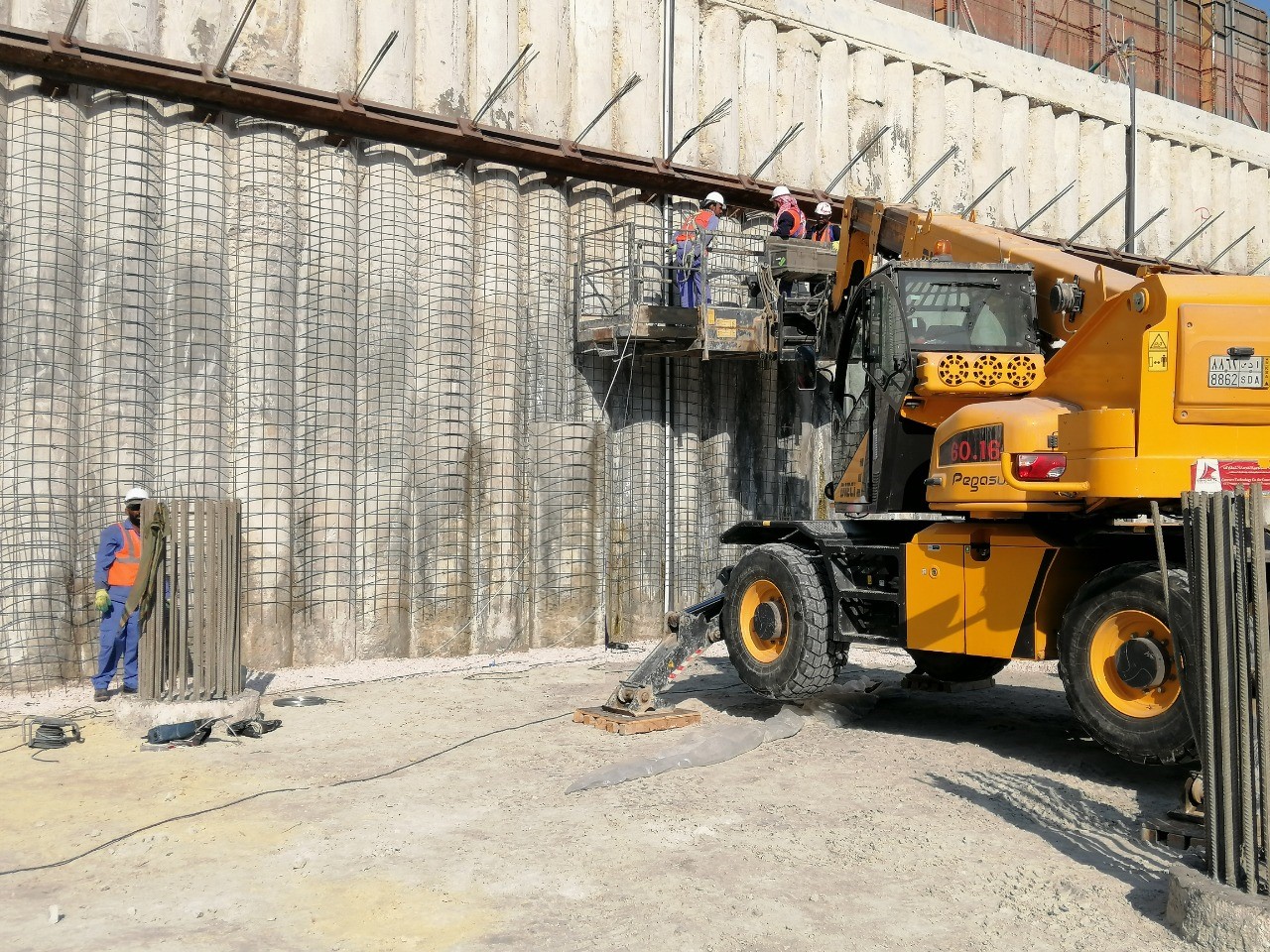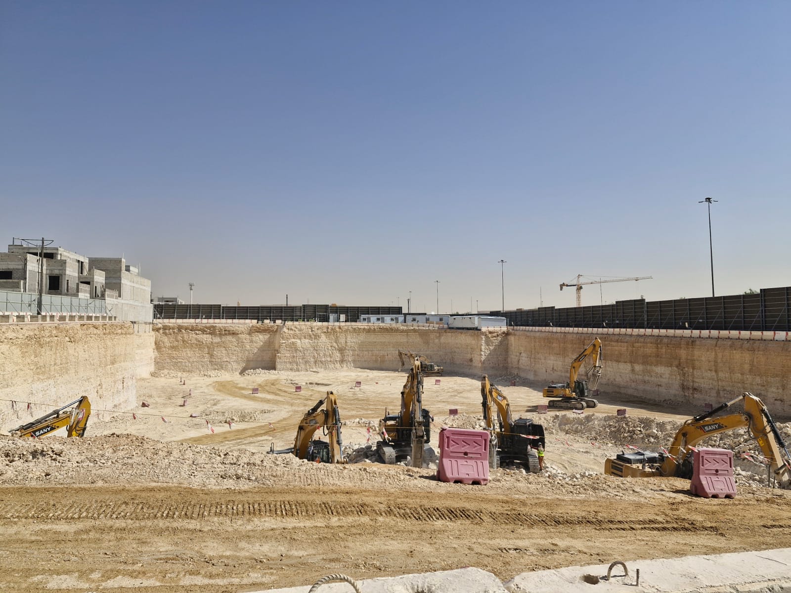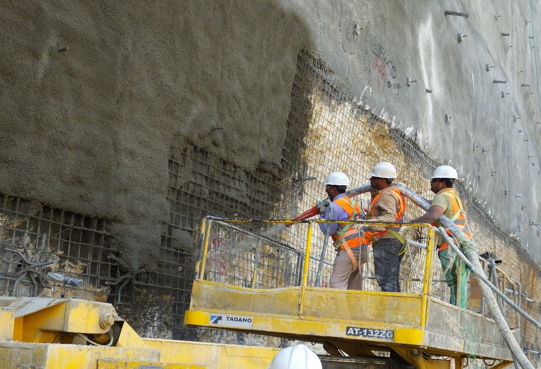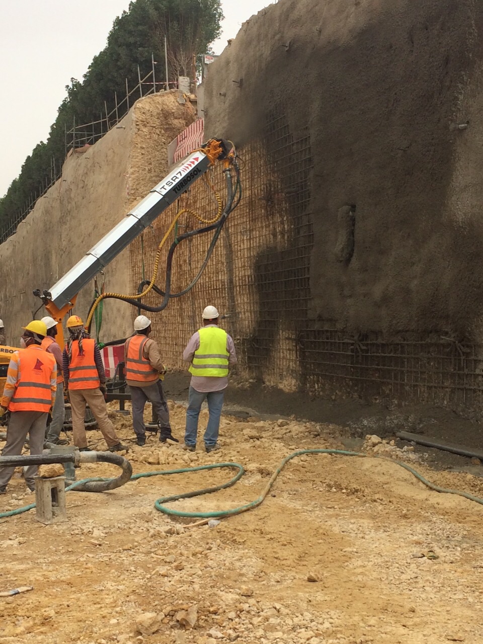 يتم تدعيم التربة بنظام الشوت كريت مع مسامير تثبيت التربة ويعتبر نظام الخرسانة المقذوفة (Shotcrete) ) هو أفضل وأكثر الحلول انتشاراً وأكثره أماناً وأقله تكلفة حيث يعمل على تثبيت التربة الضعيفة لاستكمال الحفر دون حدوث اي انهيارات او خطورة اثناء عملية الحفر وحتى الوصول للعمق المطلوب .
