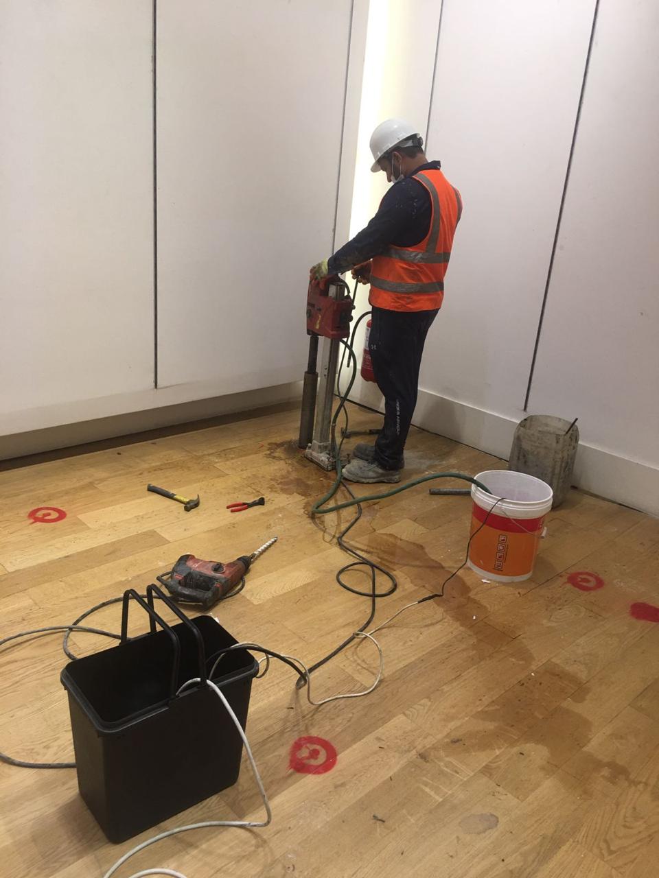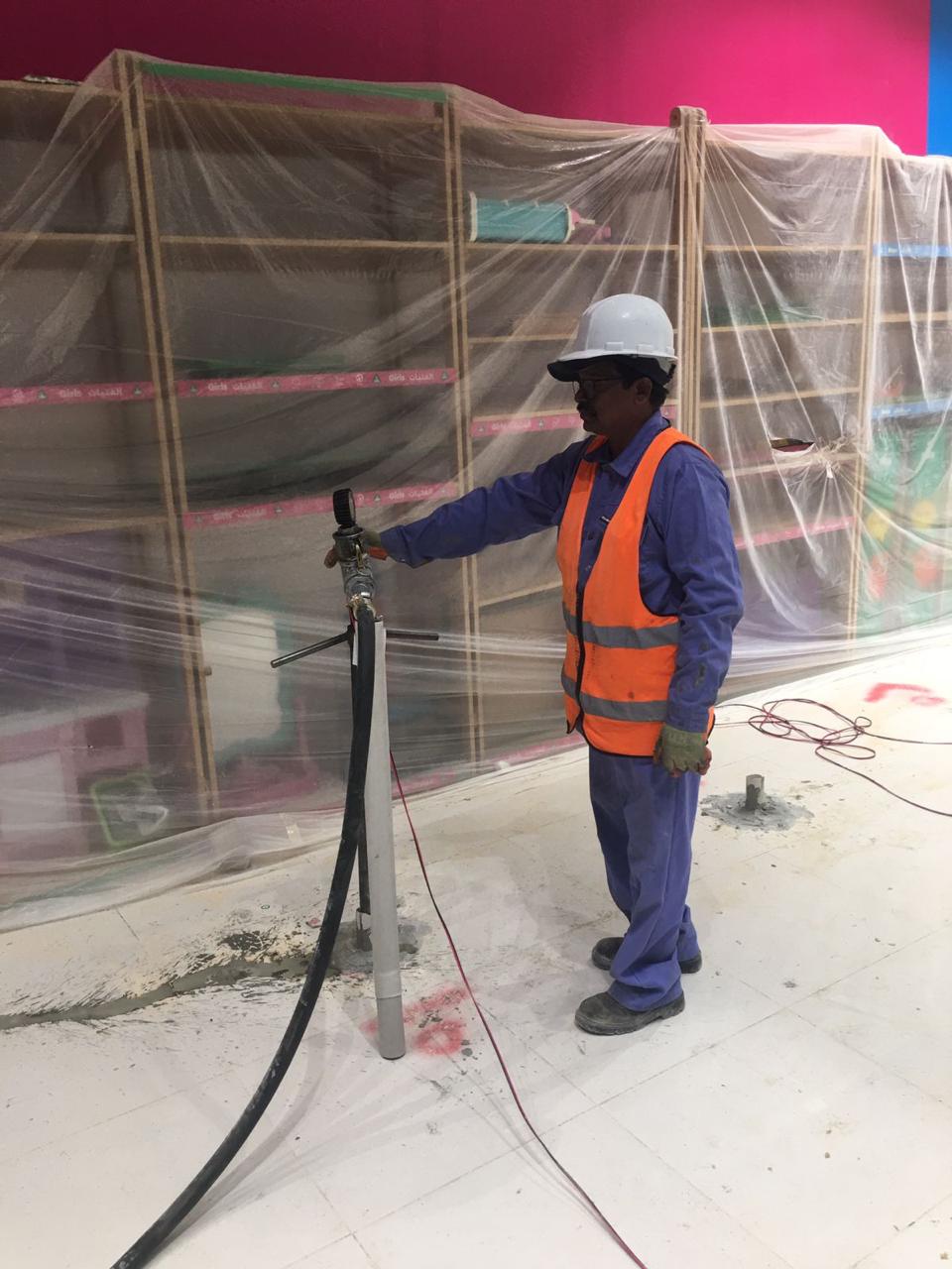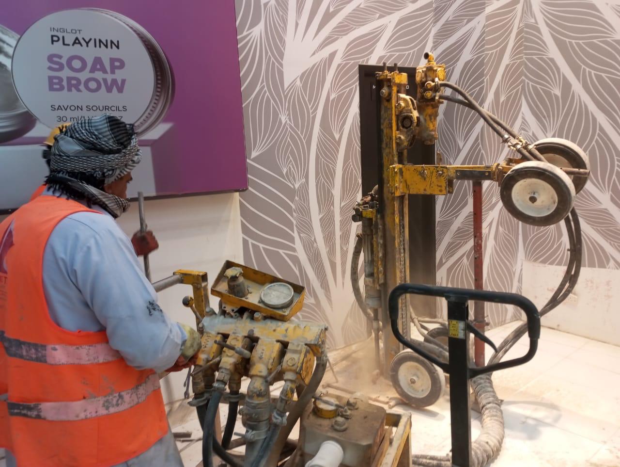 Soil grouting works were carried out for the Nakheel Mall project to improve soil properties and fill gaps beneath existing foundations and surrounding areas.