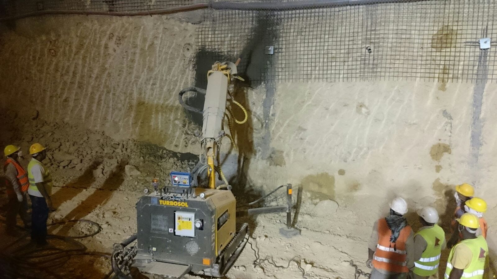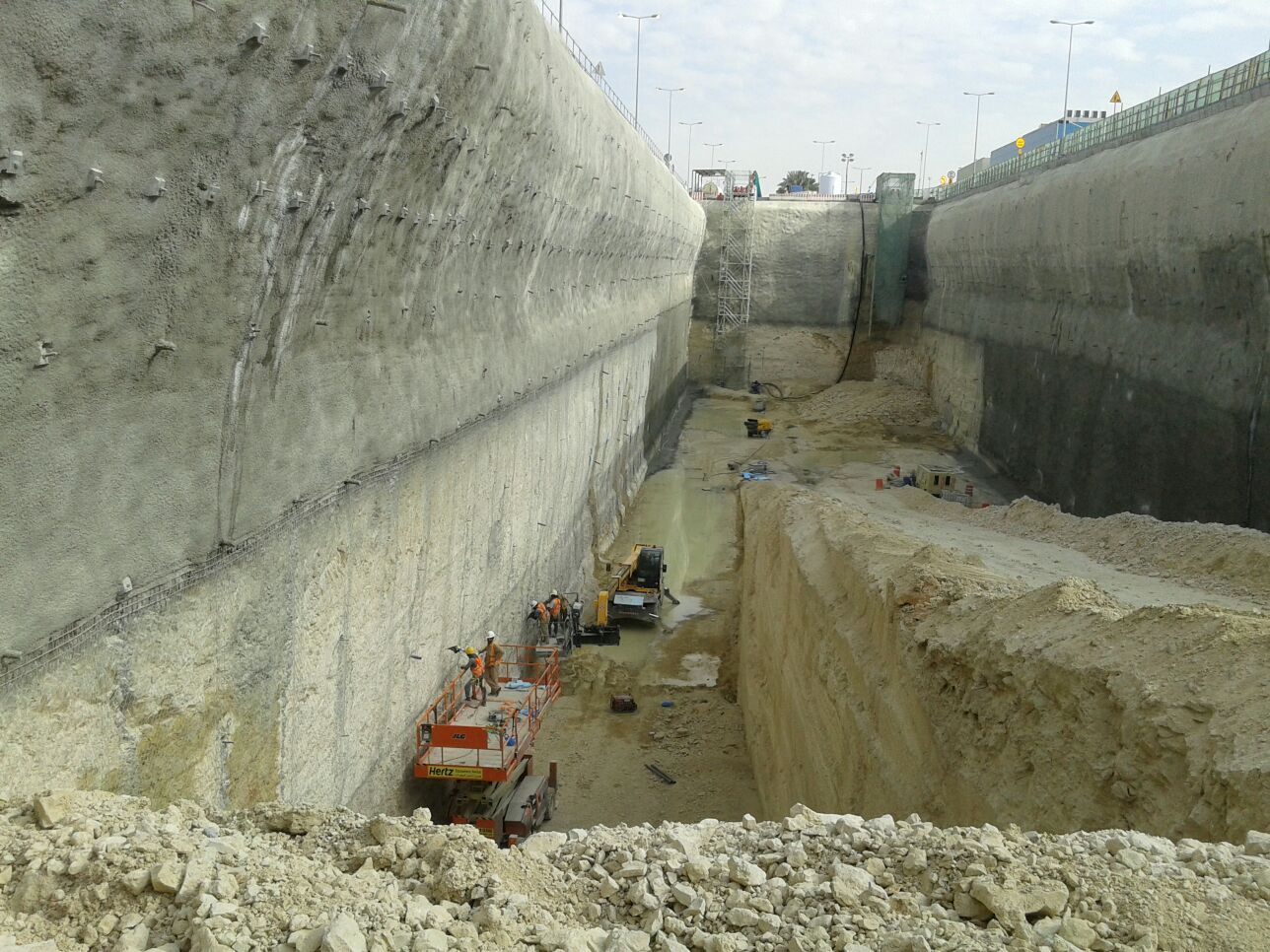 The Riyadh Metro excavation for the main station was reinforced to a depth of 32 metres using a perimeter shotcrete system supported by several rows of ground anchors to ensure the stability of the side walls during successive excavation phases.